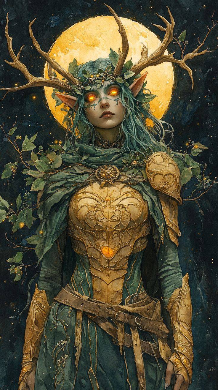 Vzhled a symbolika: Feyra je zobrazována jako mocná postava s jeleními parohy a věncem z listí, které symbolizují její spojení s divokou přírodou a cykly života. Její zbroj je zlatá a zelená, což představuje bohatství země a její sílu. Její oči žhnou oranžovým světlem, které symbolizuje energii a teplo.